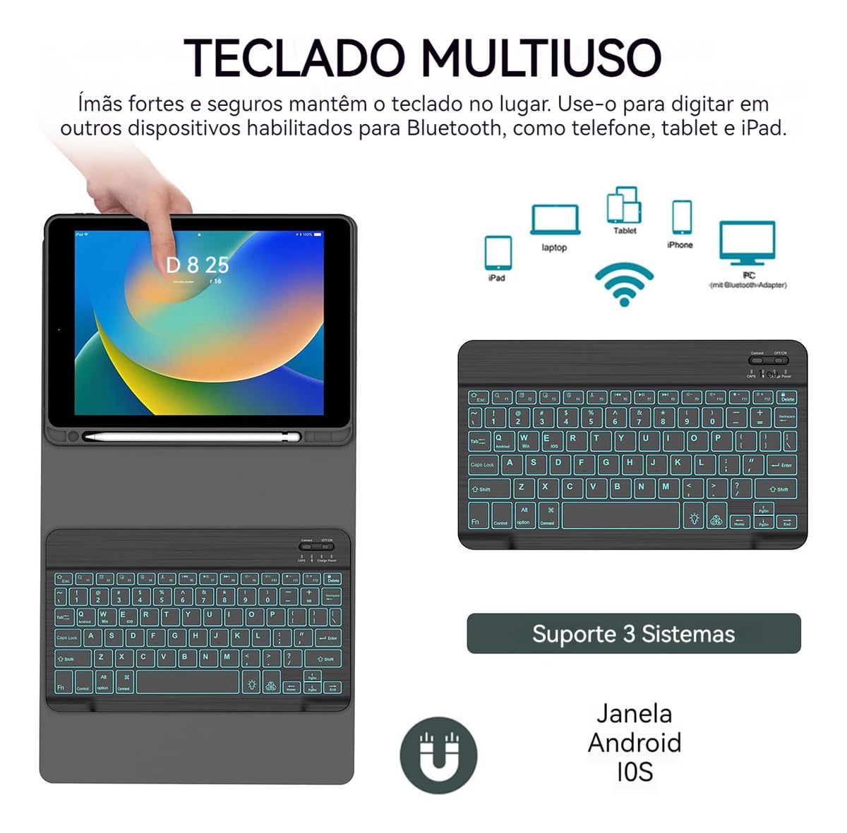 · O teclado do tablet Bluetooth adota um design magnético e pode ser facilmente instalado e removido. Possui uma variedade de teclas de atalho e o teclado adota uma estrutura de tesoura do Macbook.