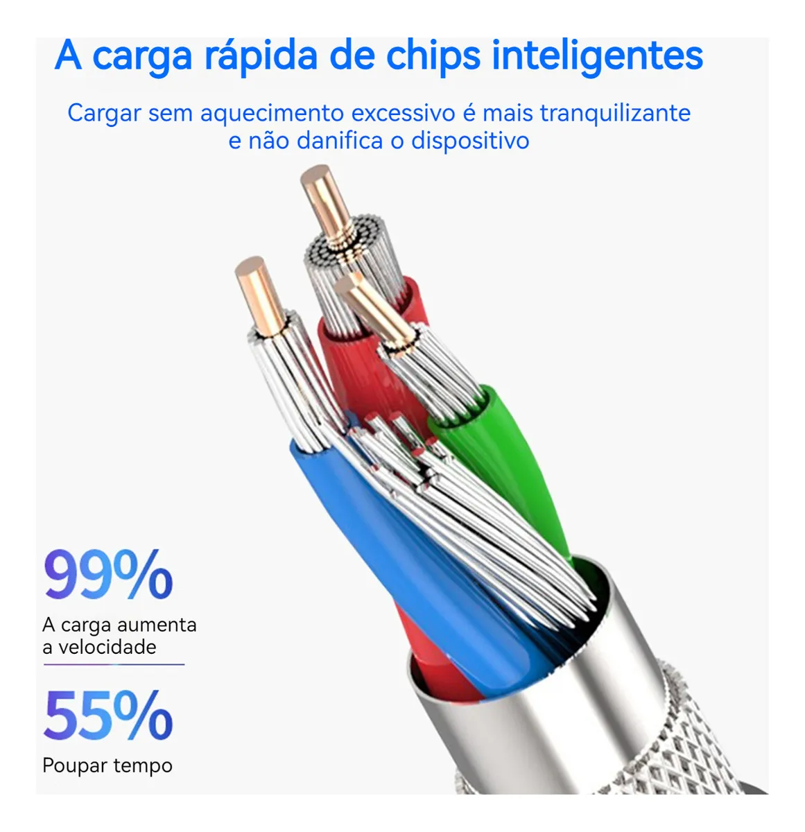 Carregamento Rápido e Seguro: Equipado com um chip inteligente, este cabo oferece carregamento rápido e seguro para seus dispositivos. Ele protege contra sobrecarga, sobrecorrente, descargas estáticas, superaquecimento e curto-circuito, garantindo que seus dispositivos estejam sempre protegidos.