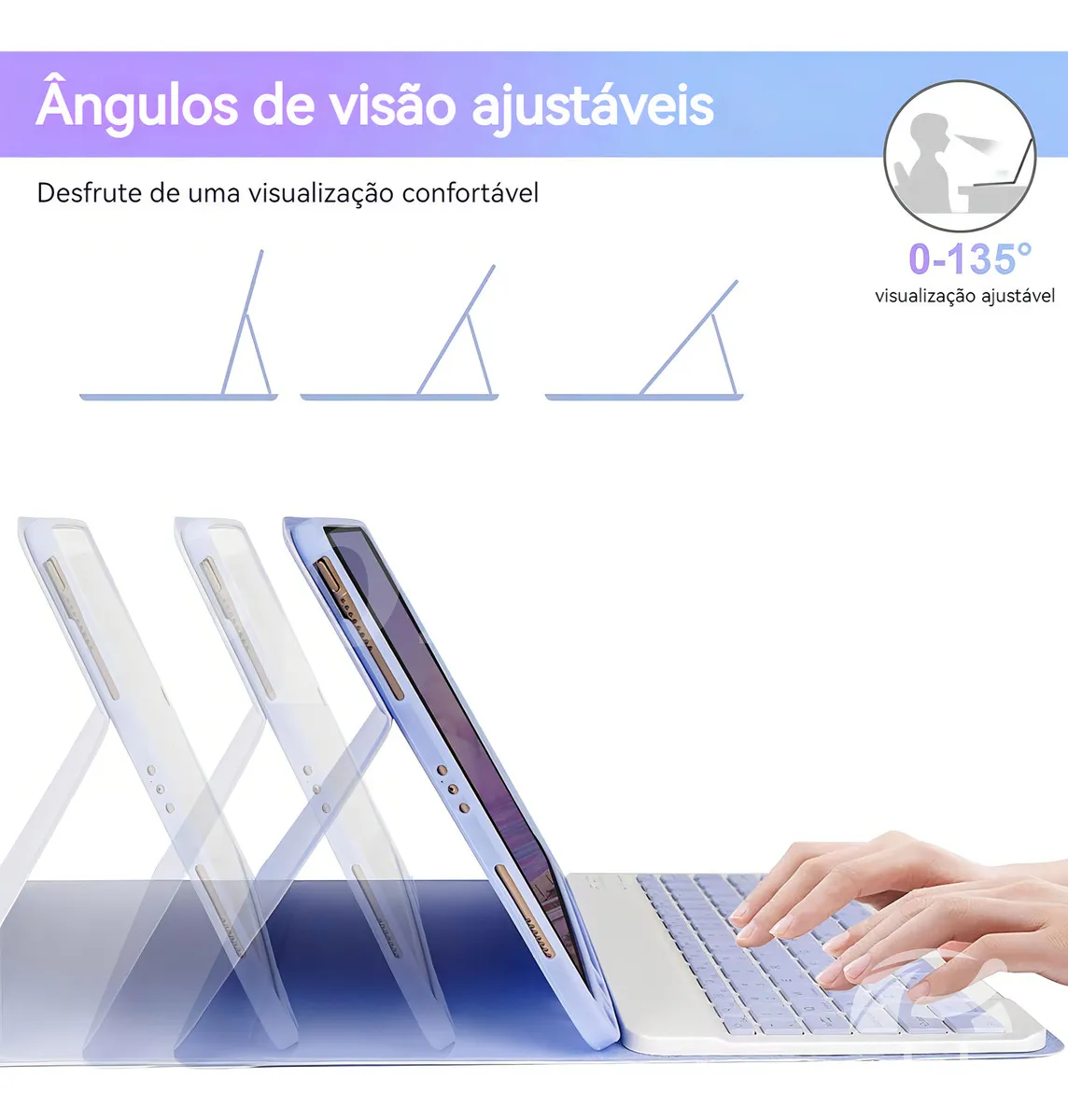 O suporte ajustável mantém seu iPad no modo paisagem com segurança.