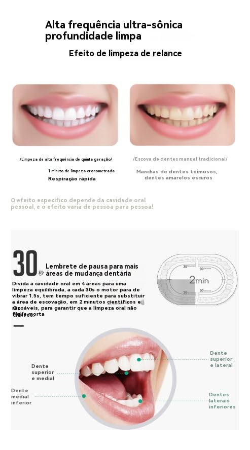 · Há vibrações em 4 ciclos e uma pausa rápida a cada 30 segundos, para que você possa escovar continuamente as 4 áreas da boca e, assim, fazer uma limpeza mais profunda.