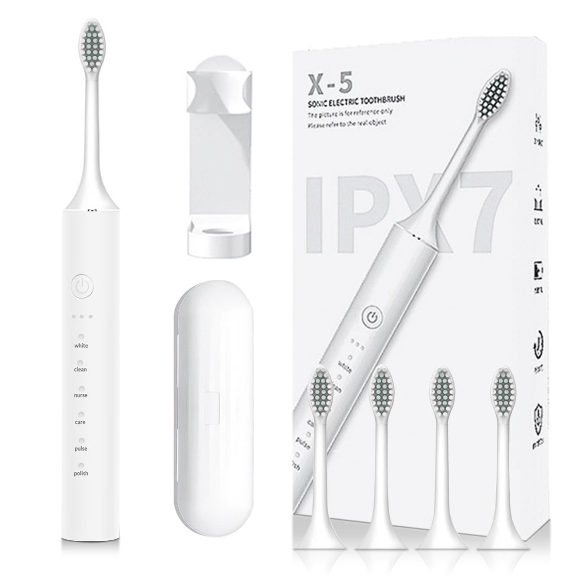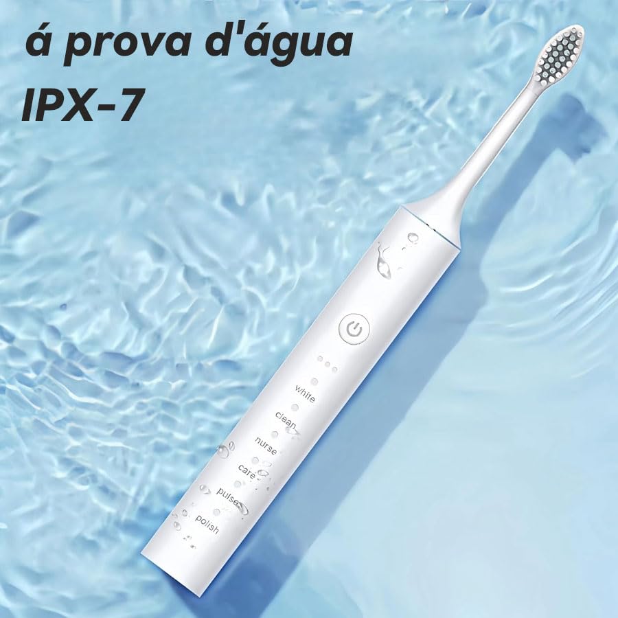 Escova de Dentes Elétrica Tem o Nível de Resistência à Água IPX7, um Temporizador Embutido de 2 minutos e 6 Modos Opcionais, Totalizando 18 Níveis. Inclui 4 Cerdas de Escova de Dentes e um Suporte