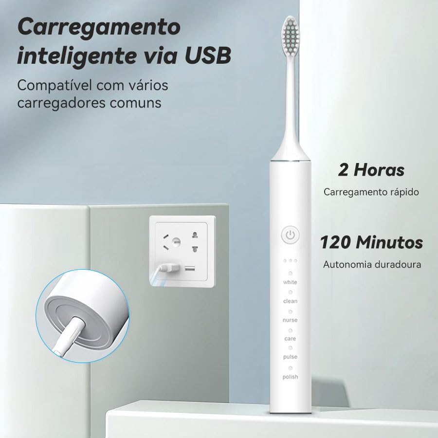 ——Informações de Segurança ——É recomendado supervisionar as crianças durante o uso. Não use a escova de dentes elétrica enquanto está banhando ou tomando banho. Substitua a cabeça a cada 2 meses. ——Instruções ——Molhe as cerdas da cabeça da escova de dentes elétrica. Aplique uma pequena quantidade de pasta de dente. Aplique as cerdas dos dentes a um ângulo de 45° em direção à linha gengival. Pressione o botão de energia para começar a escovar os dentes. Aplique leve pressão e mova a cabeça da escova lentamente sobre os dentes em movimentos pequenos para frente e para trás, de modo que a escova realize todo o trabalho. Mantenha esse movimento durante todo o processo de escovar os dentes. Observação: Para mais informações, consulte o manual do produto. ——Conteúdo do Pacote: 1 unidade de escova de dentes elétrica sônica. 4 refil de cabeças de escova de dentes. 1 manual do usuário (versões em chinês e inglês). 1 cabo de carregamento específico 1 suporte para escova de dentes.
