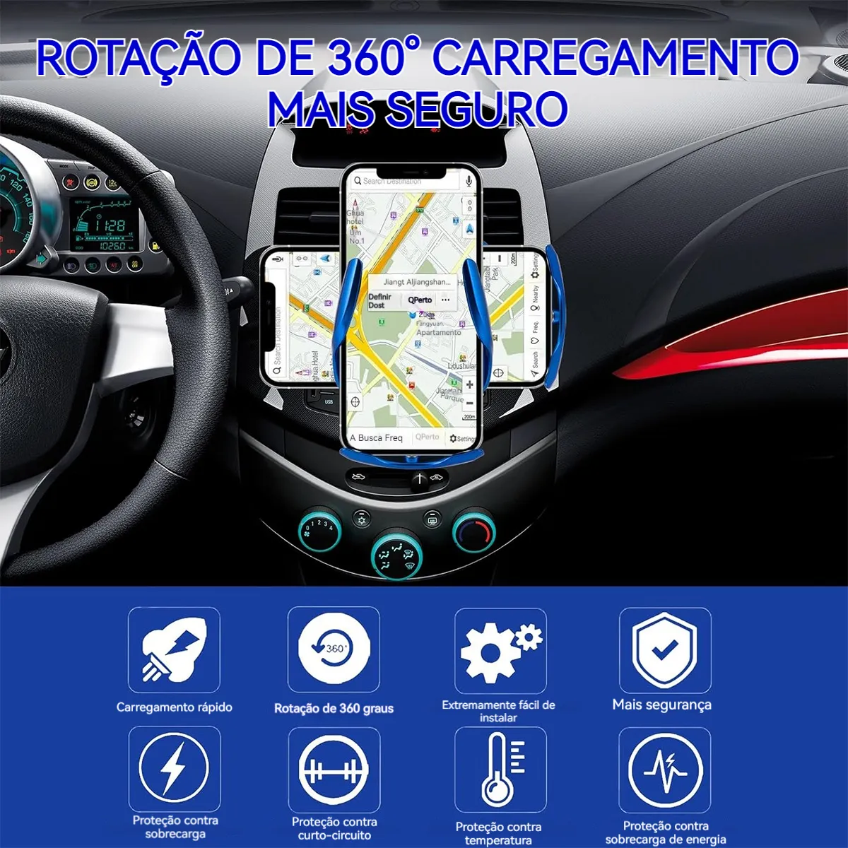 Rotação de 360 Graus: Pode ser girado em qualquer direção, garantindo que o smartphone permaneça seguro mesmo em estradas irregulares.