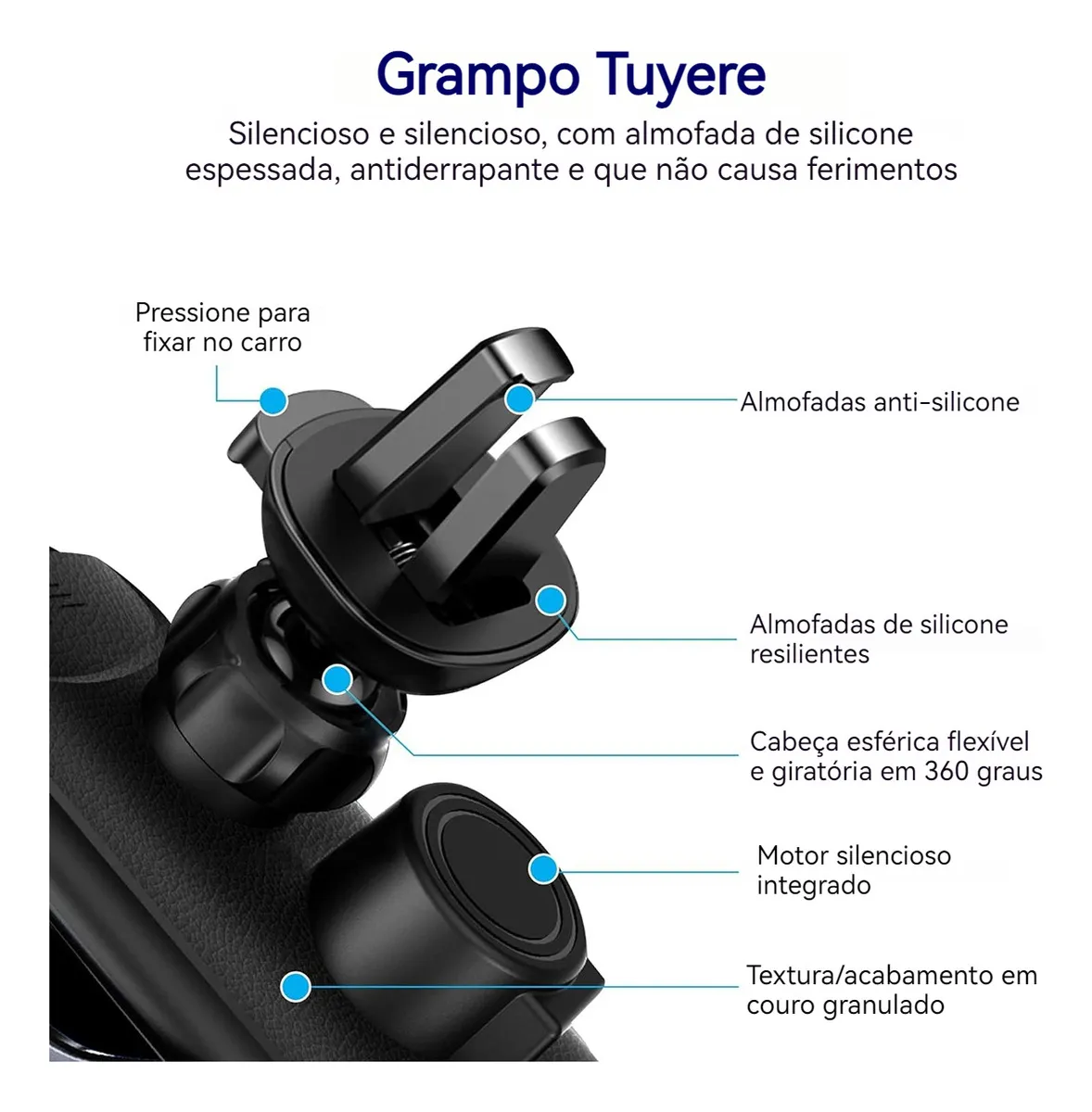 Braço de Silicone Ambiental: O braço de silicone ambiental é antiderrapante e seguro para o smartphone, garantindo um ajuste firme e sem ruídos.