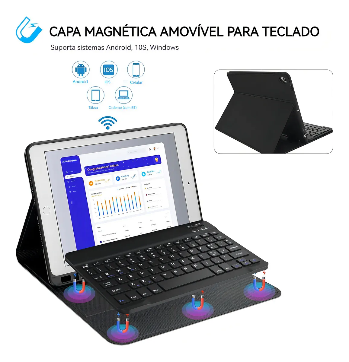 ***A parte inferior do teclado é projetada magneticamente para fácil remoção e torna seu iPad mais estável.