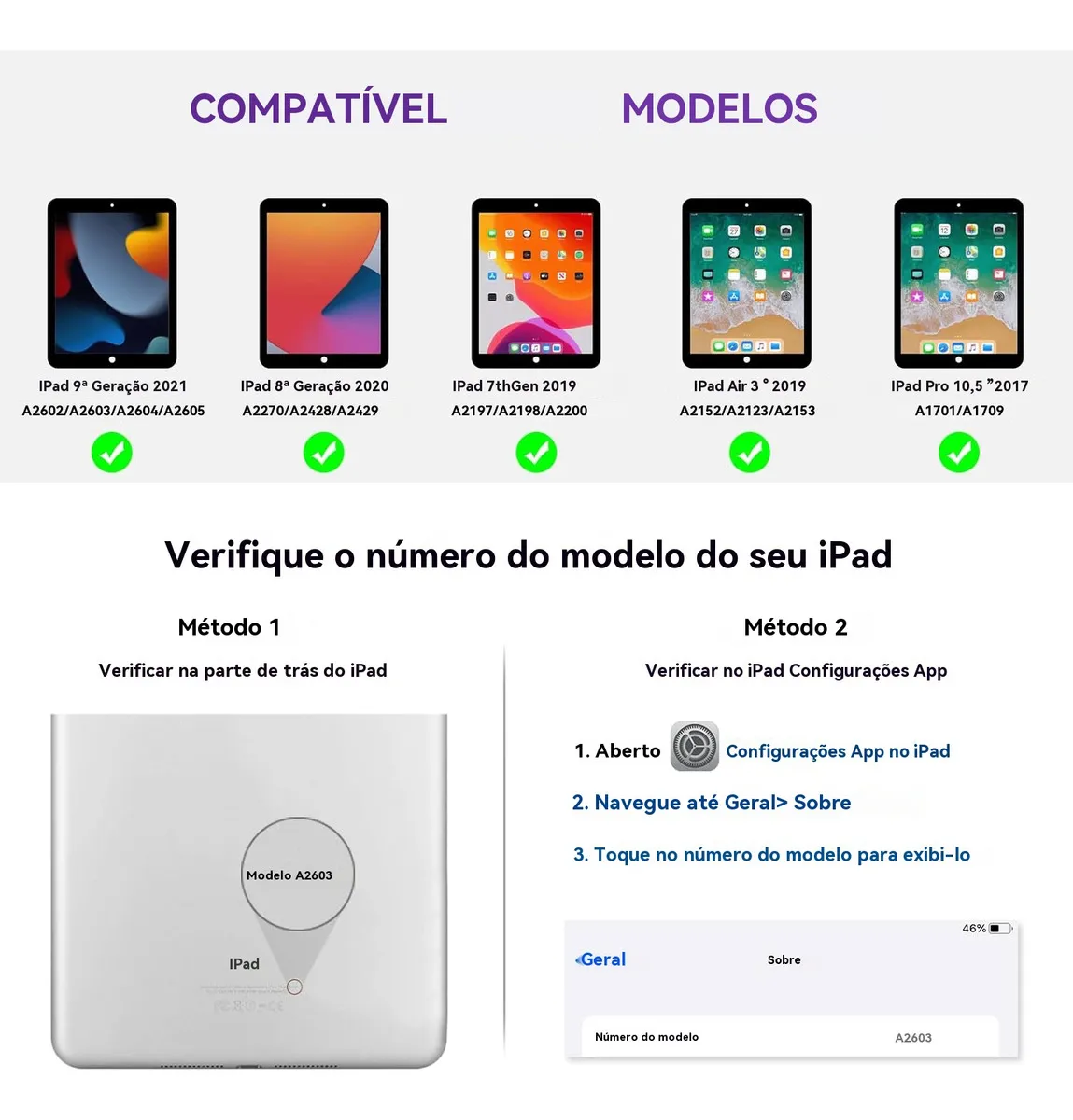 Nota: O produto deste link é compatível apenas com os modelos de iPad acima e não é compatível com outros modelos. Verifique o número do modelo começando com A mais 4 dígitos na parte de trás do iPad antes de comprar.