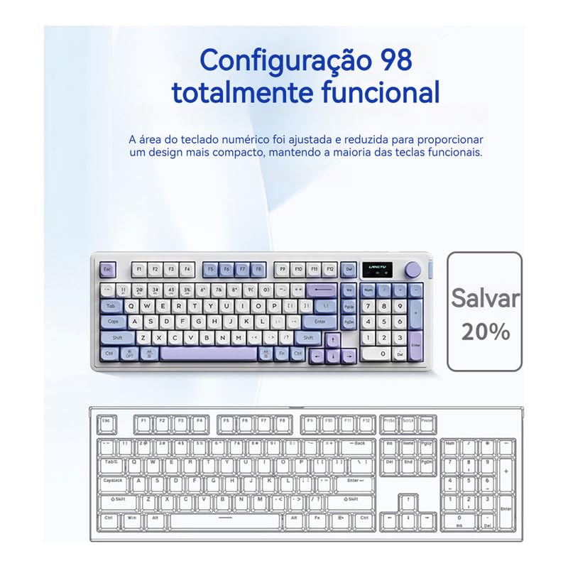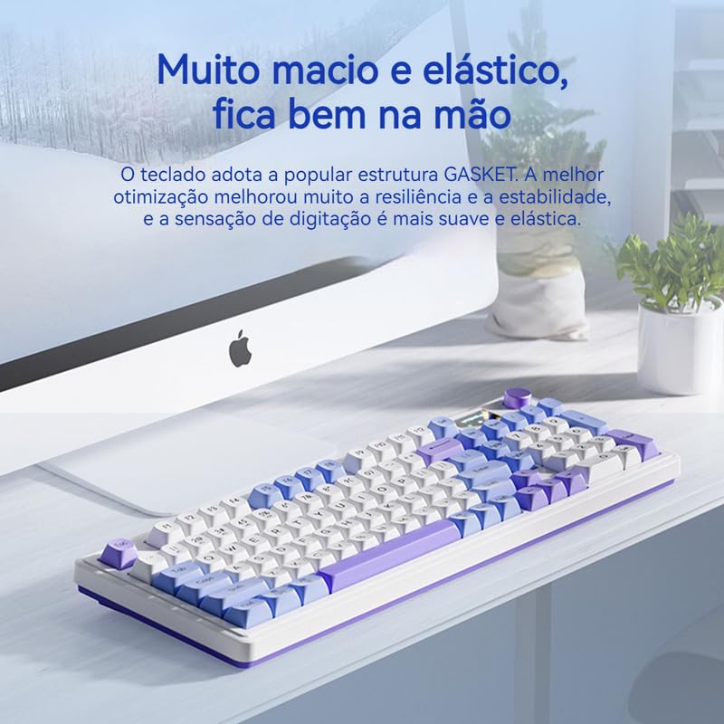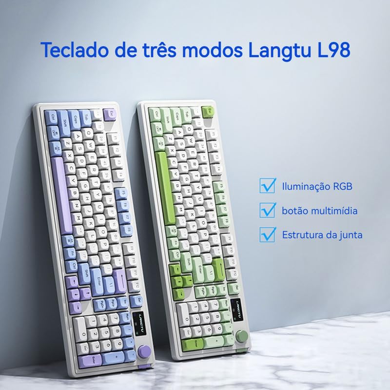 –Este teclado, com sua conectividade em três modos, experiência de teclas de alta qualidade não mecânicas, conceito de design exclusivo e poderosa autonomia de bateria, torna-se a escolha ideal para usuários que buscam eficiência no trabalho e experiências de jogos. Seja para uso diário no escritório ou para batalhas de jogos intensas, ele oferece desempenho estável e confiável, enquanto adiciona um toque de estética tecnológica à sua vida profissional e de entretenimento. *** ESPECIFICAÇÃO *** Tamanho do teclado: 413 x 145 x 43mm Peso líquido do teclado: 889,5g Modo de conexão: Modo triplo (2,4g sem fio + Bluetooth + com fio) Efeito de iluminação: luz de fundo RGB Número de teclas: 98 teclas Modo de tecla: 26 chaves sem conflito É à prova d’água: Não Comprimento do cabo: 1,5 m Tecnologia chave: Arquitetura de cratera (GASKET) Tipo de teclado: Teclado de membrana *** ITENS INCLUSOS *** 1 x Teclado 1 x Cabo de dados 1 x Manual