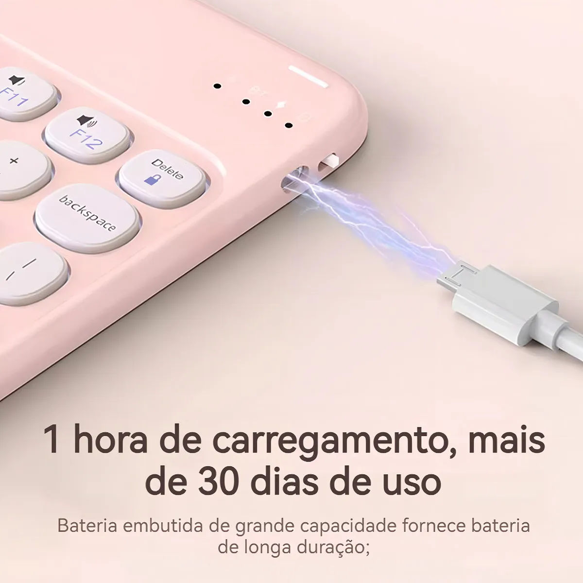 Método de conexão do teclado: Primeiro, carregue totalmente a bateria. Pressione o botão na lateral do teclado para “ON”. Mantenha pressionadas as teclas “FN+C” para ativar o modo Bluetooth do teclado.
