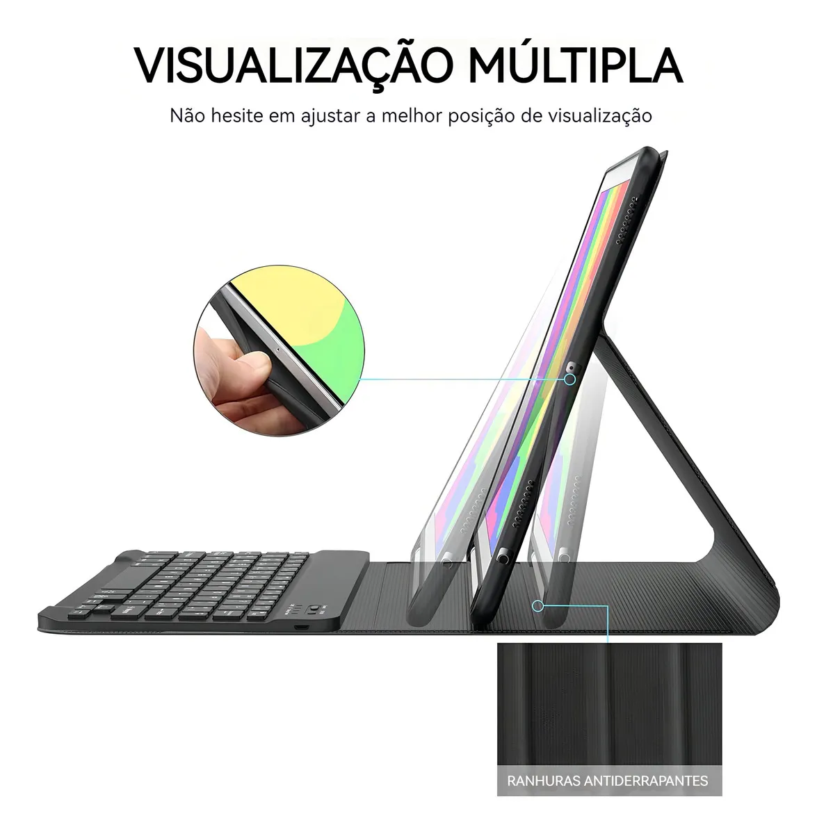 O design modular apresenta um teclado removível que transforma seu iPad em um laptop ou seu livro favorito em menos de um segundo. No modo portátil, o design inteligente ajusta-se facilmente a qualquer ângulo confortável que melhor lhe convier. Perfeito para trabalhar, escrever ou assistir a vídeos no trabalho, na escola, em viagens e em casa.