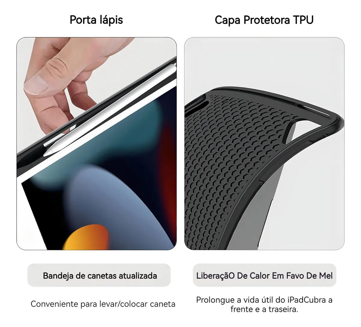 Capa Bluetooth sem fio com teclado – O design superfino adiciona proteção máxima com volume mínimo (0,38 pol.), proporcionando uma experiência de digitação suave e confortável. A parte inferior do teclado é projetada magneticamente para fácil remoção e torna seu iPad mais estável. O suporte ajustável mantém seu iPad no modo paisagem com segurança. Teclado sem fio disponível. Nosso estojo de teclado dura mais de 100 horas (tempo de espera de 30 dias)!